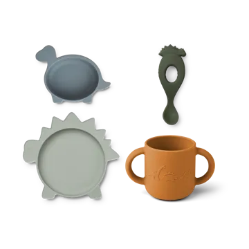 Le Set de vaisselle en silicone Vivi 4 pièces de Liewood est fabriqué en silicone durable et offre une expérience de repas sûre et colorée. Cet ensemble de vaisselle comprend une tasse, un bol, une assiette et une cuillère — une alternative durable au plastique et à la porcelaine, parfaite pour les repas des tout-petits.