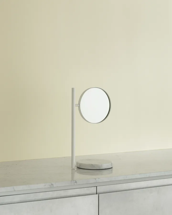 Miroir de table double face Pose 21x39 cm de Normann Copenhagen est un miroir de table épuré et minimaliste avec base en marbre, qui peut également servir de surface de rangement pour, par exemple, votre montre ou vos bijoux. Chaque miroir est entièrement unique car le marbre est un matériau naturel dont l'apparence varie. Le miroir lui‑même est double face, avec une face en verre miroir ordinaire et une face en verre grossissant (x3).