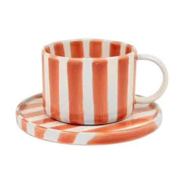 Tasse et soucoupe Monica d'Olsson & Jensen est une belle tasse en grès avec soucoupe au décor peint à la main, ce qui rend chaque exemplaire unique. Fabriquée à 100 % en grès, cette tasse avec soucoupe offre une sensation robuste et solide, adaptée autant à un usage quotidien que pour des occasions spéciales. Le motif rayé intemporel et les charmantes variations de peinture rendent chaque ensemble personnel. Parfaite pour déguster café ou thé avec style !