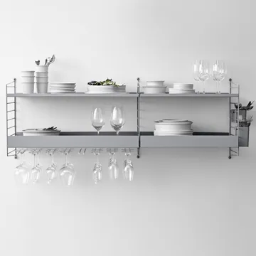 Porte-verres String lot de 2 est un accessoire de rangement de la marque String avec une construction en acier polyvalente et durable. Ils sont spécialement conçus pour suspendre des verres à pied et se fixent aux étagères métalliques String. Le porte-verres de 20 cm peut accueillir deux à trois verres à vin et celui de 30 cm peut en accueillir trois à quatre. Une étagère de 58 cm de largeur peut accueillir trois porte-verres tandis qu’une étagère de 78 cm en peut accueillir quatre. Chaque emballage contient deux porte-verres, chaque porte-verres disposant de deux jeux de rails.