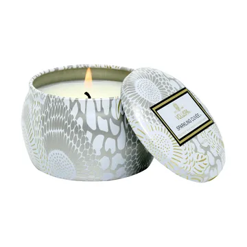 Bougie parfumée Japonica Mini Tin 25 heures de Voluspa est le cadeau parfait pour soi ou pour quelqu'un de cher. Le parfum de cette bougie est un mélange unique de vin mousseux, pamplemousse, chêne et pétales de rose, offrant une senteur fraîche et revigorante qui donne une impression de luxe à la maison. La bougie est présentée dans une petite boîte en métal avec couvercle, ce qui la rend facile à emporter en voyage ou à ranger chez soi.