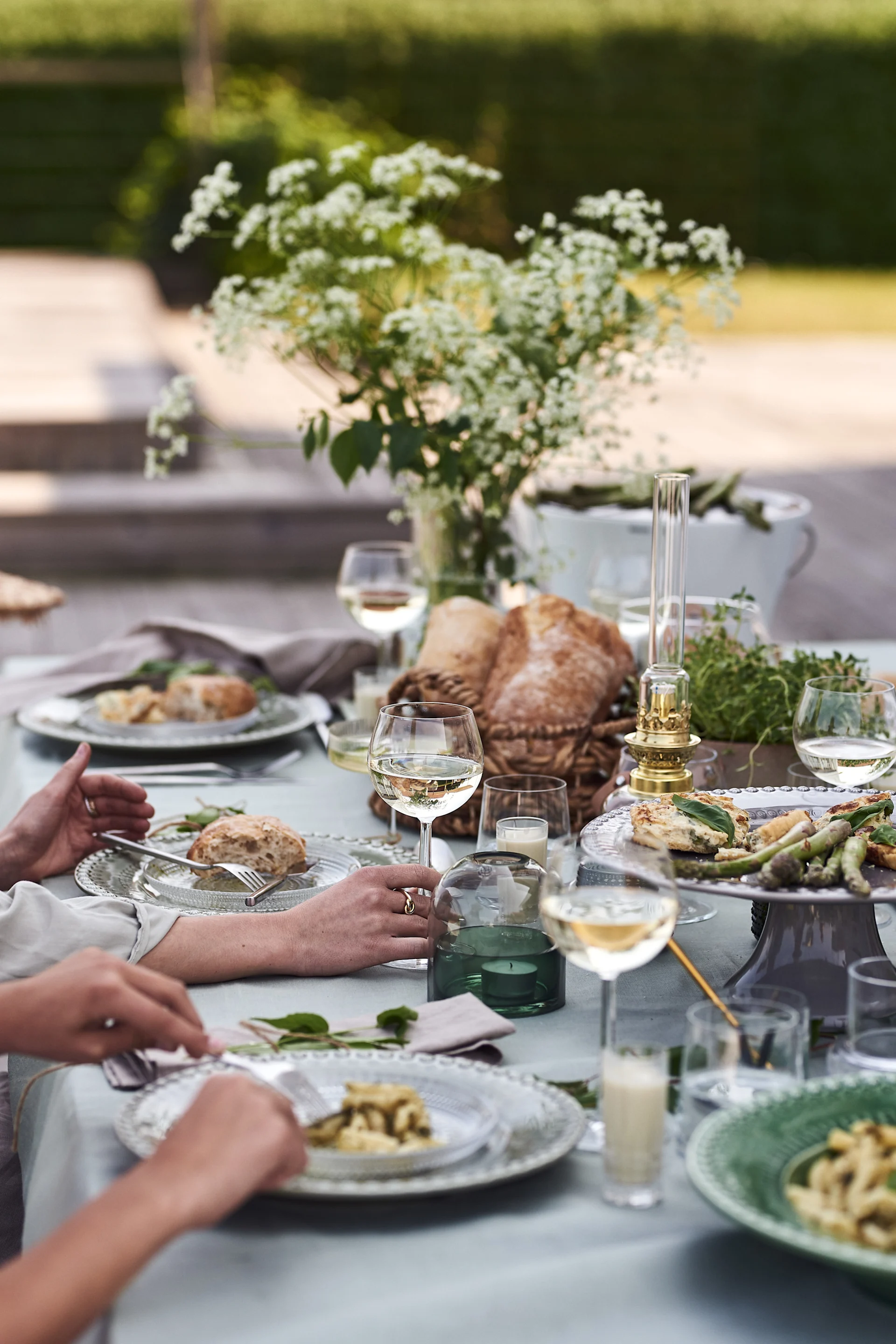 MATEUS Assiette Oyster | POTTERYJO Petite assiette Daria | IITTALA Verre Kartio | BY ON Photophore-Vase Calore green-beige | BY ON Photophore-Vase Calore beige | GEORG JENSEN Verres à vin Bernadotte