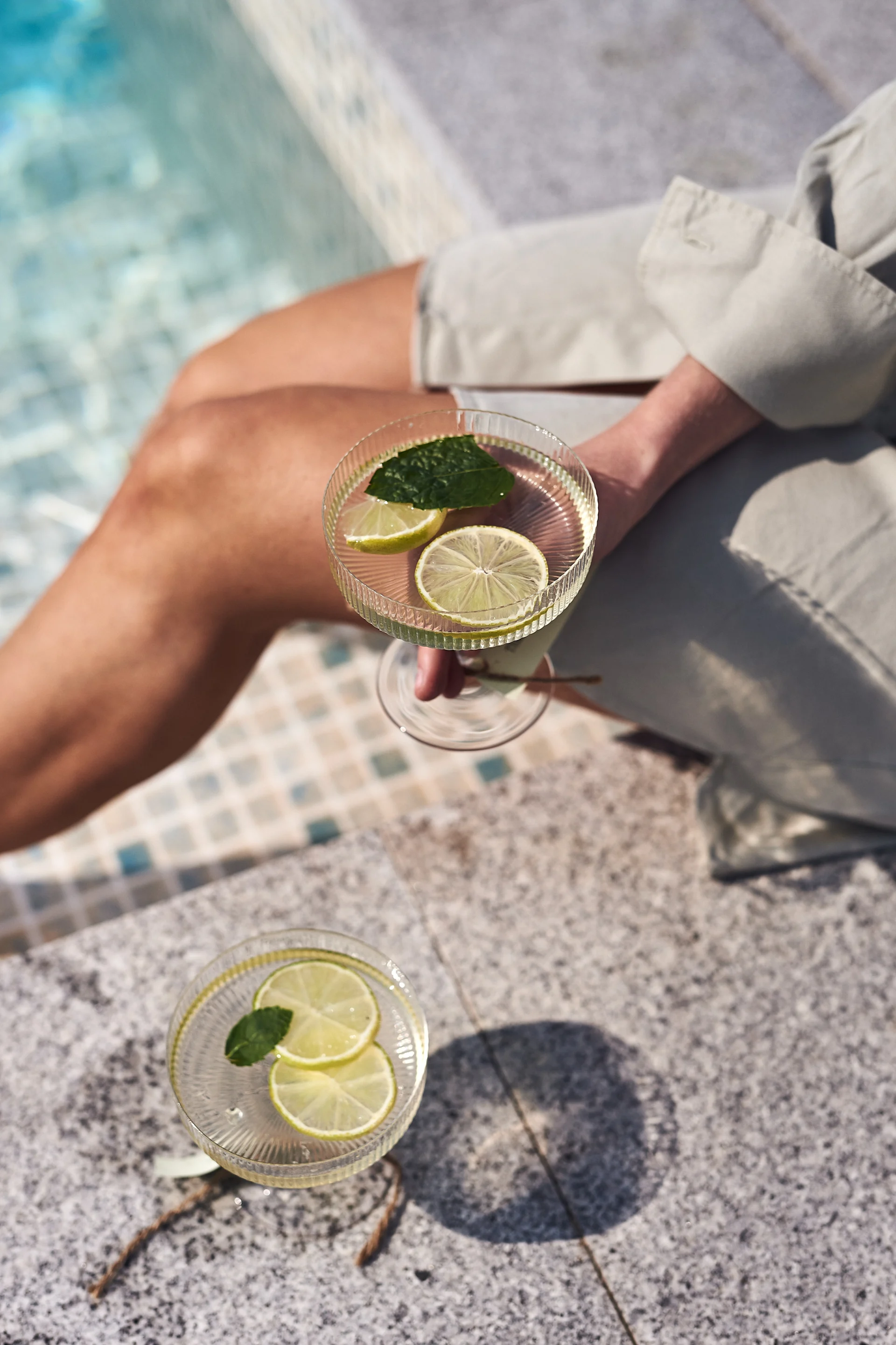 MATEUS Assiette Oyster | POTTERYJO Petite assiette Daria | IITTALA Verre Kartio | BY ON Photophore-Vase Calore green-beige | BY ON Photophore-Vase Calore beige | GEORG JENSEN Verres à vin Bernadotte